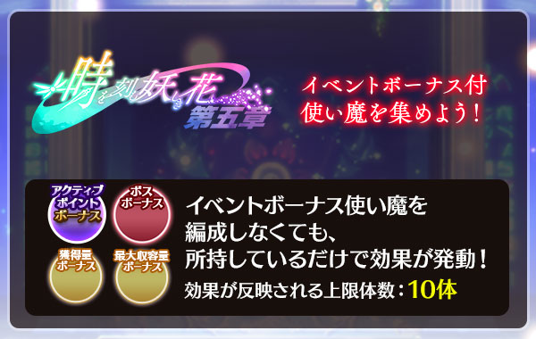 - ボーナス効果が有効なクエストでは、出撃前画面の「ボーナス確認」ボタンと常若の大樹>強化>「ボーナス確認」ボタンから対象使い魔とボーナス効果を確認できます。