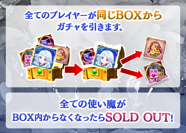 - 【BOX内すべての中身が0】もしくは【BOX内の目玉使い魔の残数が0】になった場合、「SOLD OUT」となり、本シェアBOXガチャを引くことができなくなります。