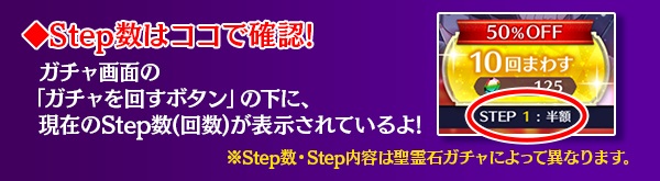 - ステップアップガチャは、Step数によってガチャの提供内容が変化します。 Step数の上昇により必ずしも提供内容がより良い内容に変化することを保証するわけではありません。
