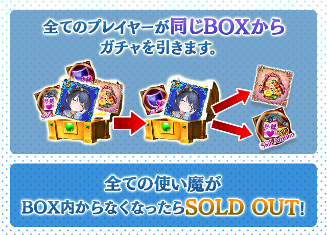 - 【BOX内すべての中身が0】もしくは【BOX内の目玉使い魔の残数が0】になった場合、「SOLD OUT」となり、本シェアBOXガチャを引くことができなくなります。
