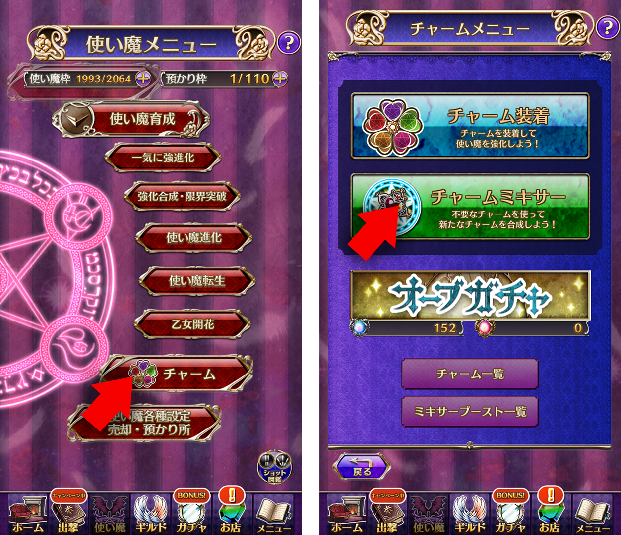 チャームミキサーはフッター使い魔>チャーム内のチャームミキサーボタンから遷移できるよ!