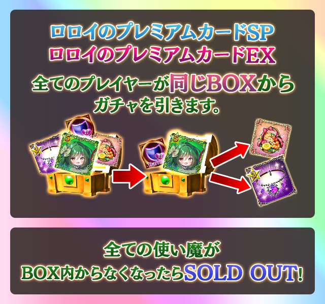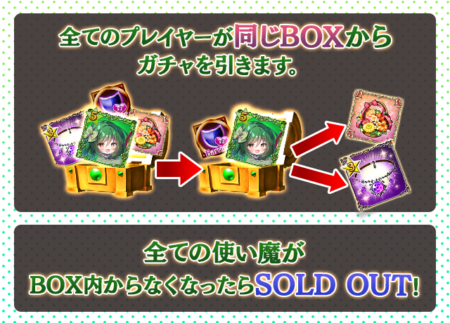 - 【BOX内すべての中身が0】もしくは【BOX内の目玉使い魔の残数が0】になった場合、「SOLD OUT」となり、本シェアBOXガチャを引くことができなくなります。