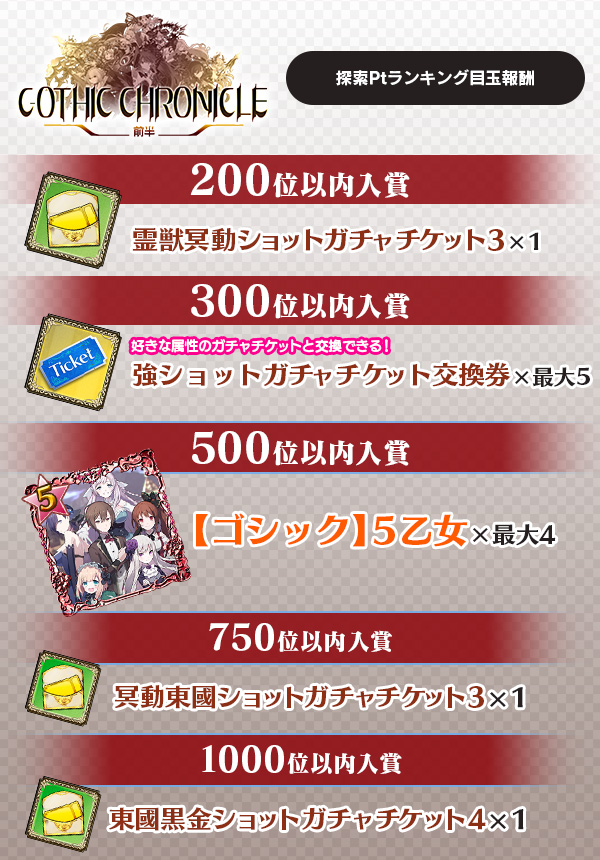 | 3000位 以内入賞 | スコアタオススメ使い魔交換券Ⅲ Ⅲは冥動・東國・黒金ショット持ち使い魔がラインナップ | 各最大3枚 |