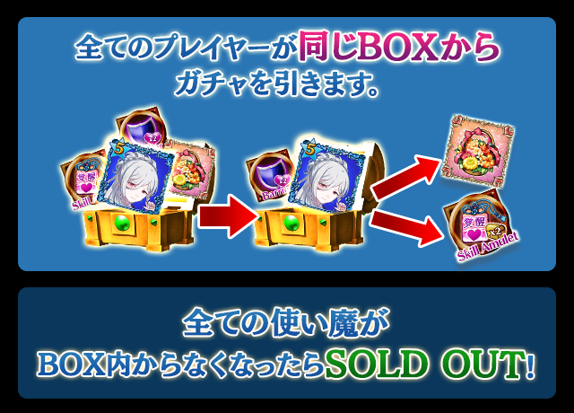 - 【BOX内すべての中身が0】もしくは【BOX内の目玉使い魔の残数が0】になった場合、「SOLD OUT」となり、本シェアBOXガチャを引くことができなくなります。