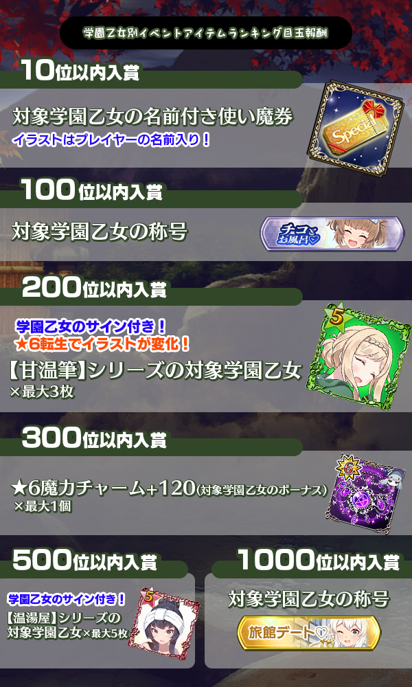 | 50位以内 入賞 | 強ショットガチャチケット4(対象乙女の属性) | 1枚 |