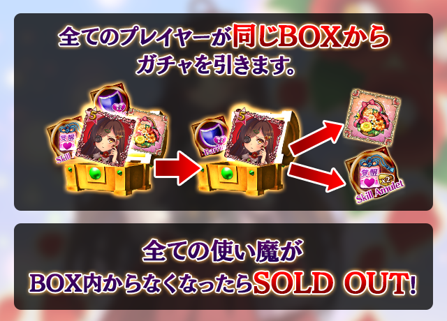 - 【BOX内すべての中身が0】もしくは【BOX内の目玉使い魔の残数が0】になった場合、「SOLD OUT」となり、本シェアBOXガチャを引くことができなくなります。