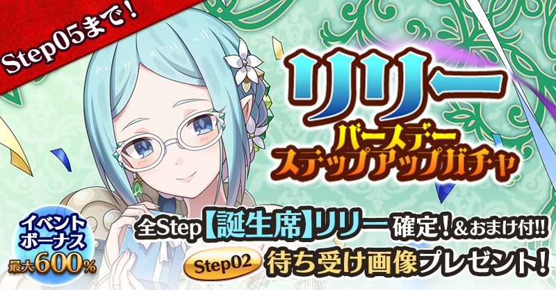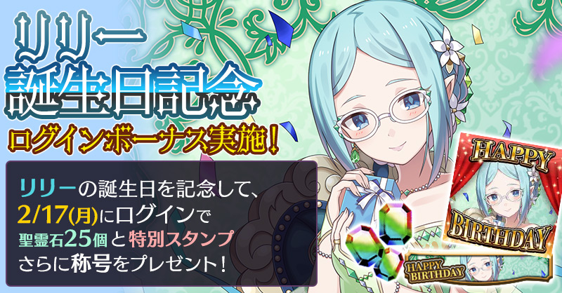 リリーの誕生日を記念して、誕生日当日にログインすると「聖霊石:25個」と、掲示板で使用できる特別スタンプや、称号をプレゼント!!