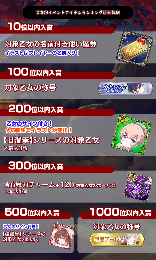 | 50位以内 入賞 | 強ショットガチャチケット4(対象乙女の属性) | 1枚 |
