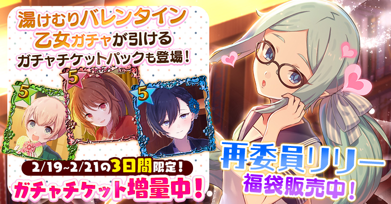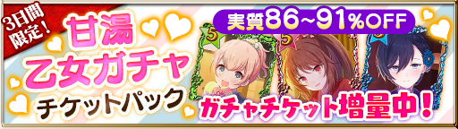 ※ガチャチケット増量中の甘湯乙女ガチャチケットパックを2/21(金)までに購入していた場合でも、2/22(土)から販売される通常の甘湯乙女ガチャチケットパックを購入できます。