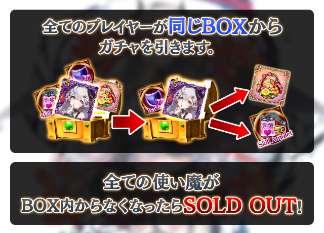 - 【BOX内すべての中身が0】もしくは【BOX内の目玉使い魔の残数が0】になった場合、「SOLD OUT」となり、本シェアBOXガチャを引くことができなくなります。