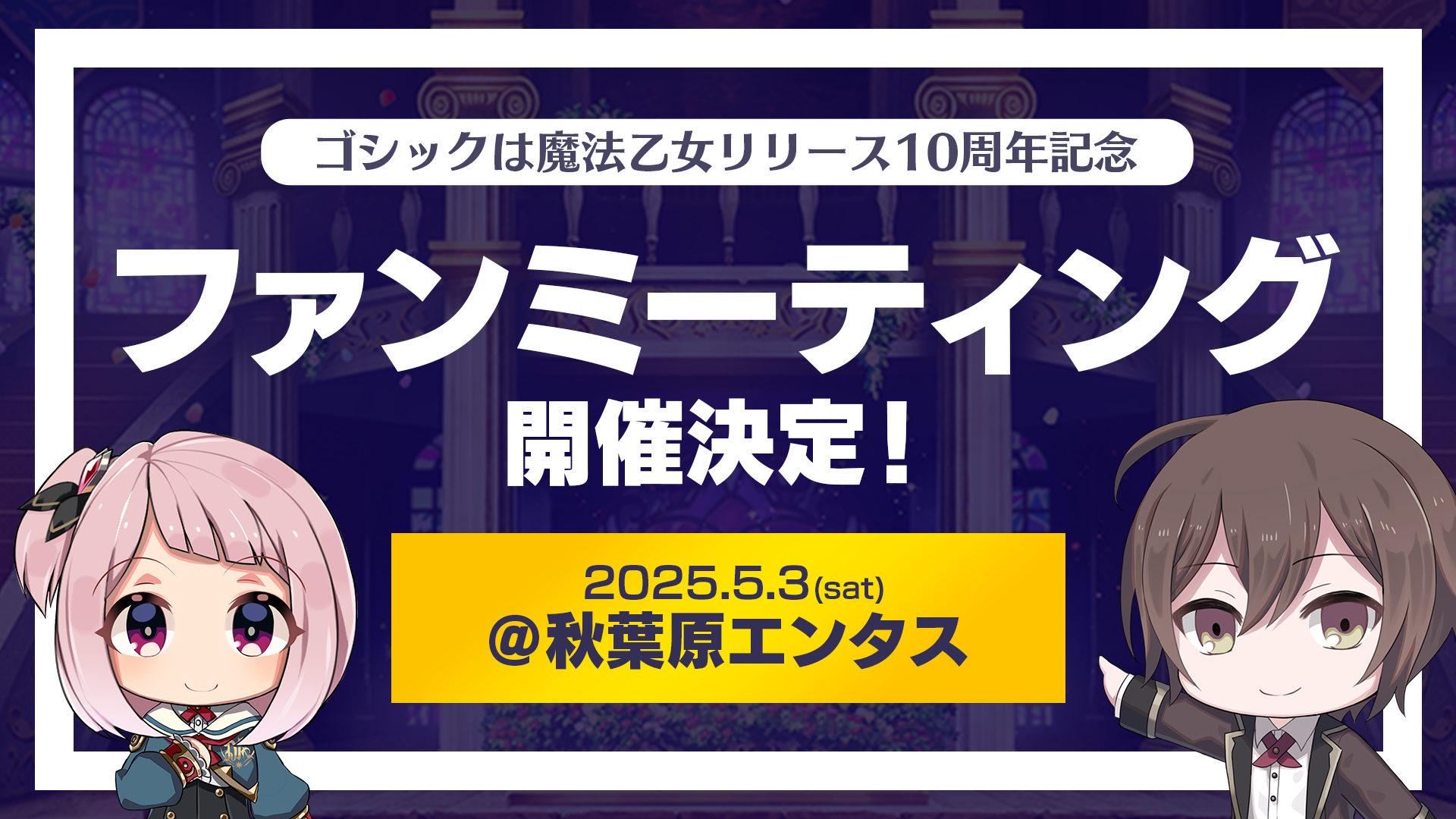 「ゴシックは魔法乙女」リリース10周年記念! ファンミーティング開催決定! ■概要 ステージイベントやごまおつに関する展示、オリジナルグッズの販売などを実施予定!! ■日時 2025/5/3(土)11:00スタート予定 時間は前後する場合がございます。 ■場所 秋葉原エンタス 詳細は後日公開予定!お楽しみに♡