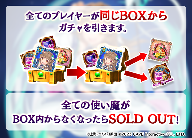 - 【BOX内すべての中身が0】もしくは【BOX内の目玉使い魔の残数が0】になった場合、「SOLD OUT」となり、本シェアBOXガチャを引くことができなくなります。