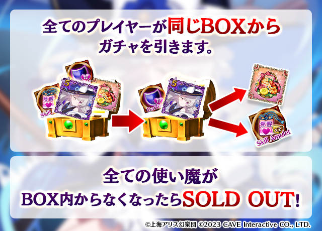 - 【BOX内すべての中身が0】もしくは【BOX内の目玉使い魔の残数が0】になった場合、「SOLD OUT」となり、本シェアBOXガチャを引くことができなくなります。