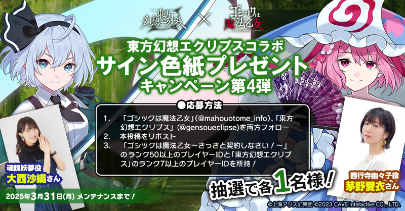 東方幻想エクリプスとゴシックは魔法乙女の公式アカウントを両方フォロー&対象の投稿をRPした方の中から魂魄妖夢役「大西沙織」さんと西行寺幽々子役「茅野愛衣」さんの色紙を抽選で各1名様にプレゼント!