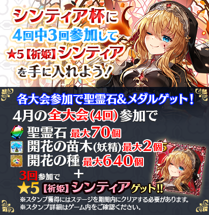 【毎週土曜!3回参加で★5【祈姫】シンティアGET】4月全国スコア大会!!