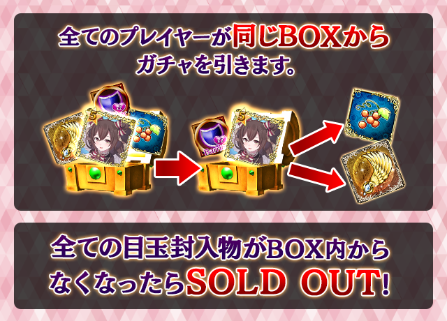 - 【BOX内すべての中身が0】もしくは【BOX内の目玉封入物の残数が0】になった場合、「SOLD OUT」となり、本シェアBOXガチャを引くことができなくなります。