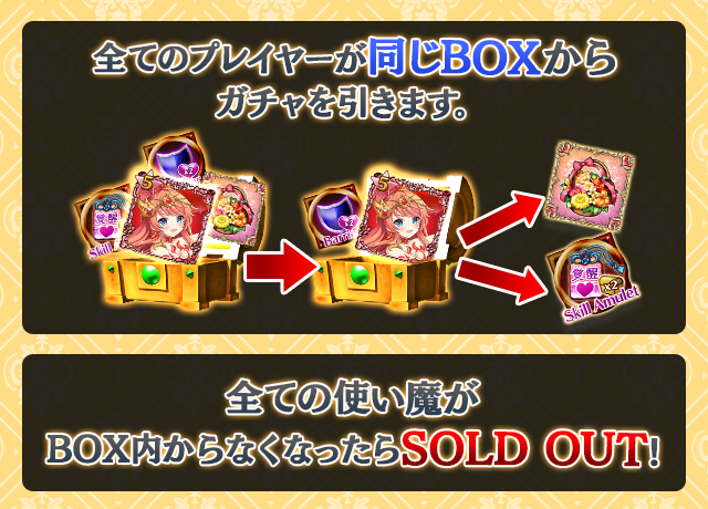 - 【BOX内すべての中身が0】もしくは【BOX内の目玉使い魔の残数が0】になった場合、「SOLD OUT」となり、本シェアBOXガチャを引くことができなくなります。