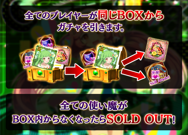 - 【BOX内すべての中身が0】もしくは【BOX内の目玉使い魔の残数が0】になった場合、「SOLD OUT」となり、本シェアBOXガチャを引くことができなくなります。