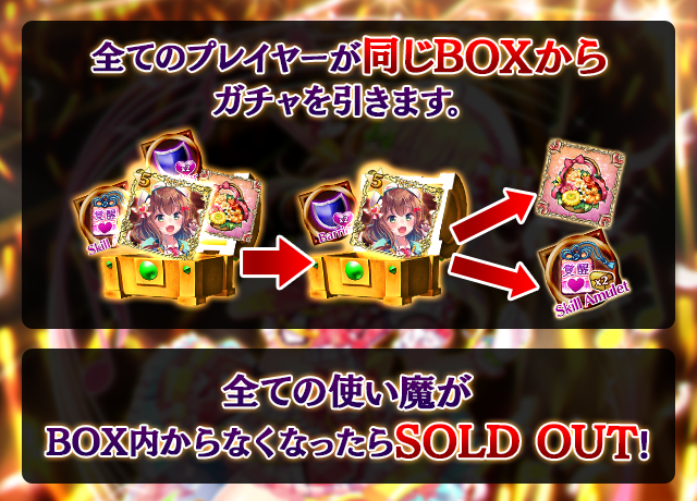 - 【BOX内すべての中身が0】もしくは【BOX内の目玉使い魔の残数が0】になった場合、「SOLD OUT」となり、本シェアBOXガチャを引くことができなくなります。