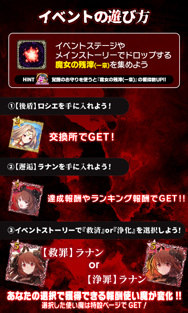 - 「救済」「浄化」を未選択の場合、ホーム画面左下の「ストーリー」からも選択は可能です。ただし「魔女の残滓(一章)」獲得数の条件を満たしていない場合、報酬使い魔は獲得できません。