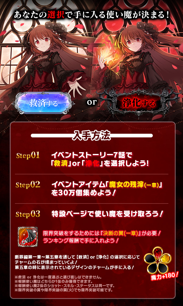 - 第一章~第五章すべての章で【救罪】【浄罪】シリーズどちらかの報酬使い魔を獲得することで、選択が反映されたデザインの魔力+180チャームを獲得することができます。