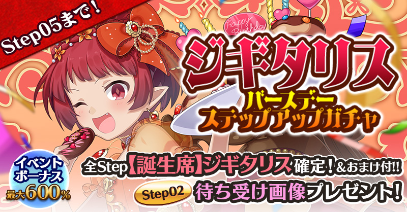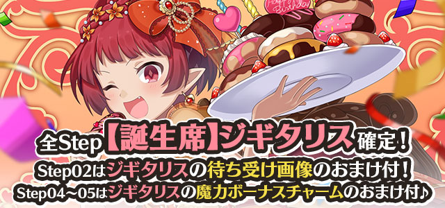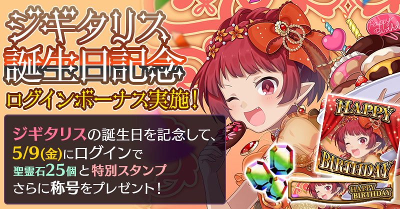 ジギタリスの誕生日を記念して、誕生日当日にログインすると「聖霊石:25個」と、掲示板で使用できる特別スタンプや、称号をプレゼント!!