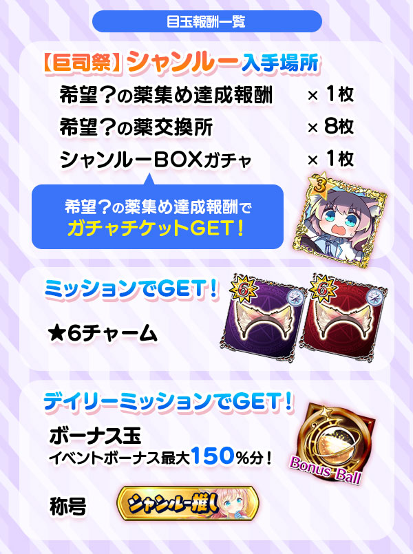 | 3日目(5/12) | ボーナス玉(イベントボーナス50%分) 称号「シャンルー推し」×1 |
