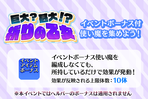 ★「強化合成」で使い魔を強化した際に得られる経験値が2倍! ★「使い魔進化」で使い魔を進化する際に必要な進化素材数が半分! ★「スキル強化」で各スキルアップ使用時のスキルレベル上昇率が通常時の2倍! ★ステージクリア時に獲得できる出撃親密度が2倍! 従来の必要進化素材数を半分にしたときに端数が発生した場合、端数は切り上げとなります。 進化する際の消費メダル数に変更はありません。