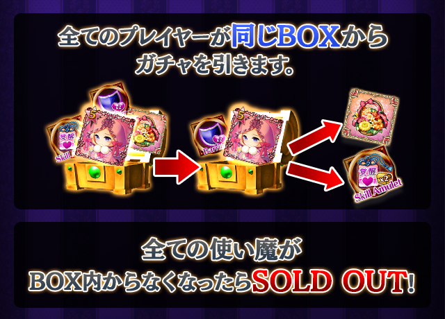 - 【BOX内すべての中身が0】もしくは【BOX内の目玉使い魔の残数が0】になった場合、「SOLD OUT」となり、本シェアBOXガチャを引くことができなくなります。