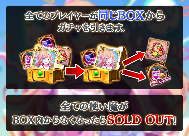 - 【BOX内すべての中身が0】もしくは【BOX内の目玉使い魔の残数が0】になった場合、「SOLD OUT」となり、本シェアBOXガチャを引くことができなくなります。