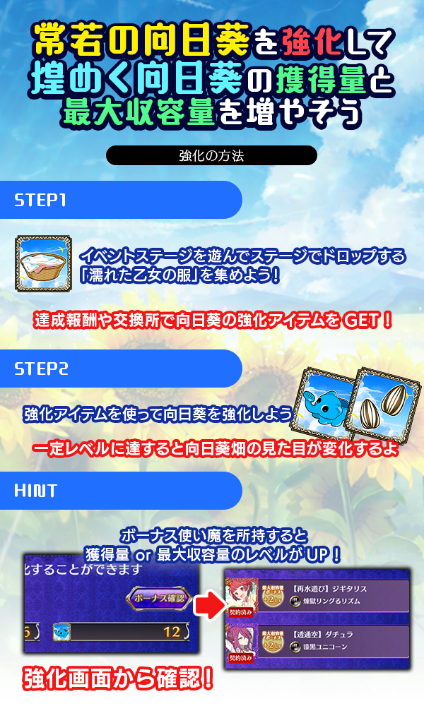 2025/7/22(火)0:00~メンテナンス開始までは溜まっている煌めく向日葵の回収や向日葵の強化、即時獲得の機能は使用できます。