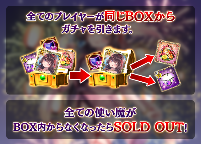 - 【BOX内すべての中身が0】もしくは【BOX内の目玉使い魔の残数が0】になった場合、「SOLD OUT」となり、本シェアBOXガチャを引くことができなくなります。