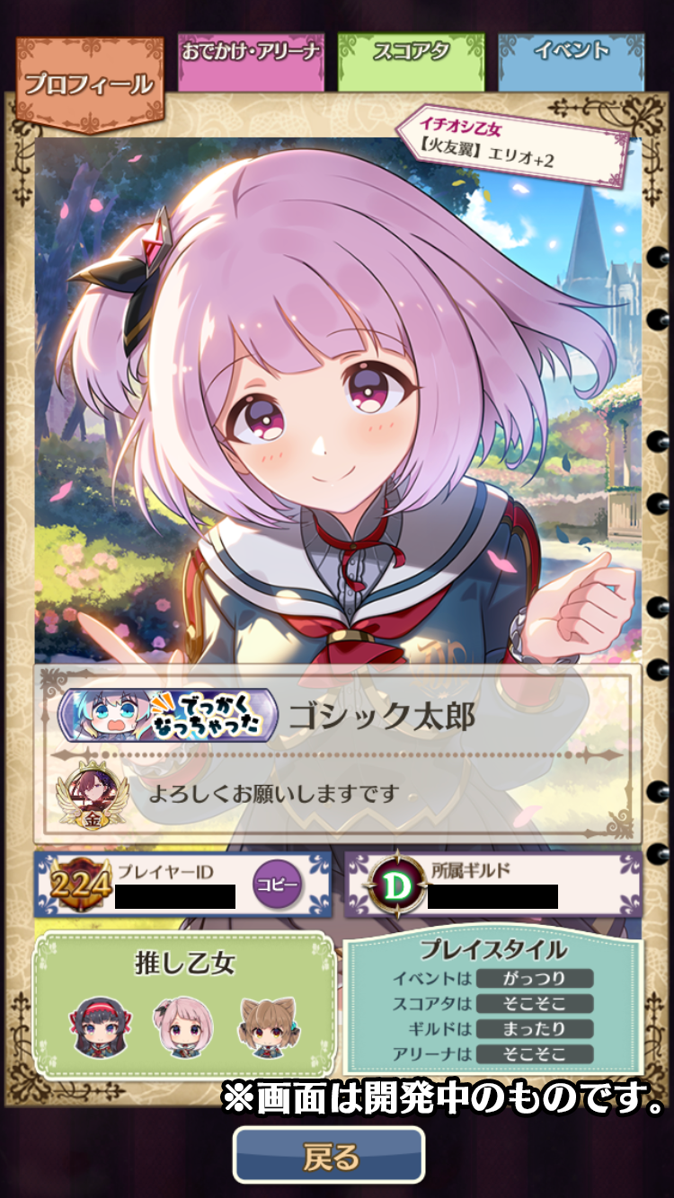 イチオシ乙女に設定した使い魔のイラスト表示が大きくなり、設定している称号も表示されるようになりました。