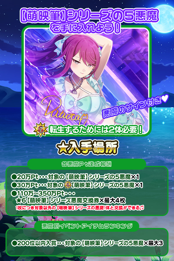 各悪魔30万Pt達成報酬は★6で配布! - さらに、各悪魔Pt達成報酬の「★6【萌映筆】シリーズ悪魔交換券A~E」は★6転生済みで交換可能!