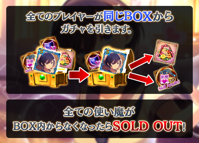 - 【BOX内すべての中身が0】もしくは【BOX内の目玉使い魔の残数が0】になった場合、「SOLD OUT」となり、本シェアBOXガチャを引くことができなくなります。