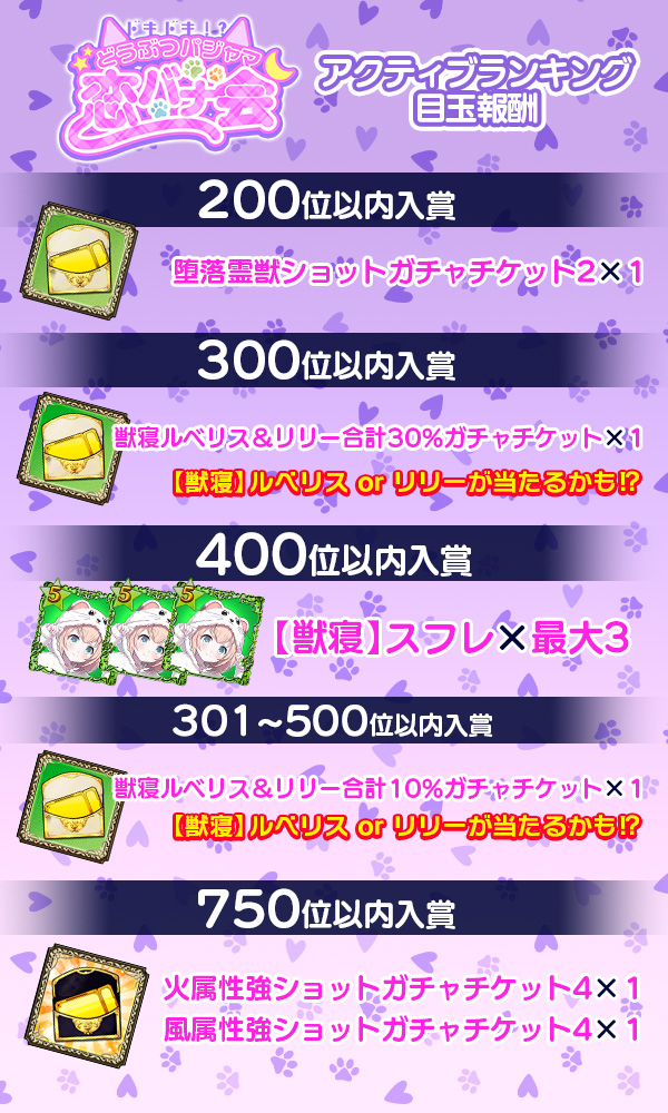 - 達成報酬はホーム画面[イベント]ボタン上のランキングボタン>[各種ランキング]内の[報酬を見る]や[ポイント達成報酬を見る]より確認できます。