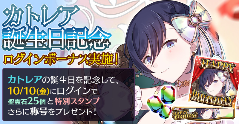 カトレアの誕生日を記念して、誕生日当日にログインすると「聖霊石:25個」と、掲示板で使用できる特別スタンプや、称号をプレゼント!!