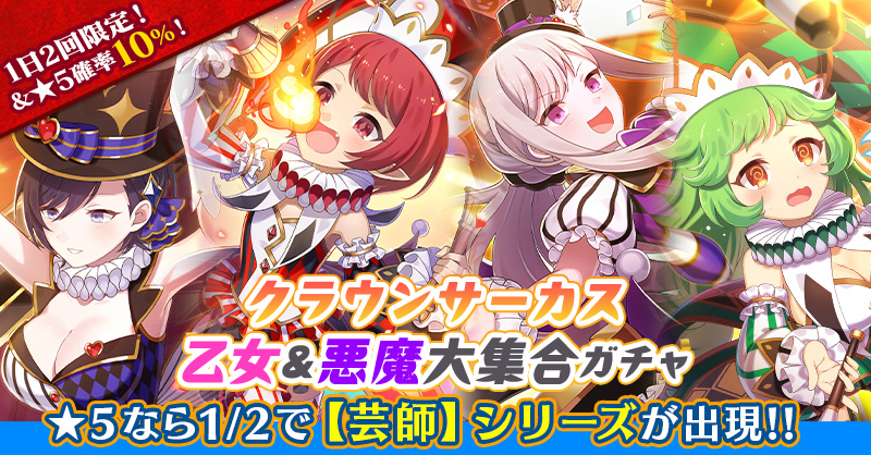 【1日2回限定&★5確率10%!★5なら【芸師】シリーズ出現率1/2!】クラウンサーカス乙女&悪魔大集合ガチャ