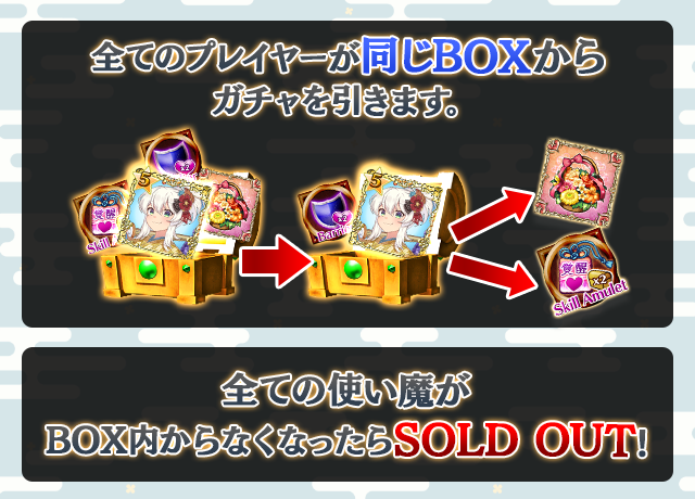 - 【BOX内すべての中身が0】もしくは【BOX内の目玉使い魔の残数が0】になった場合、「SOLD OUT」となり、本シェアBOXガチャを引くことができなくなります。