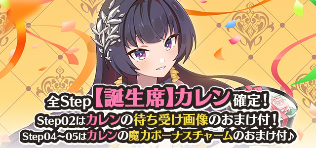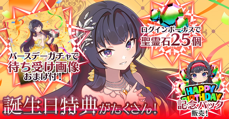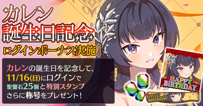 カレンの誕生日を記念して、誕生日当日にログインすると「聖霊石:25個」と、掲示板で使用できる特別スタンプや、称号をプレゼント!!