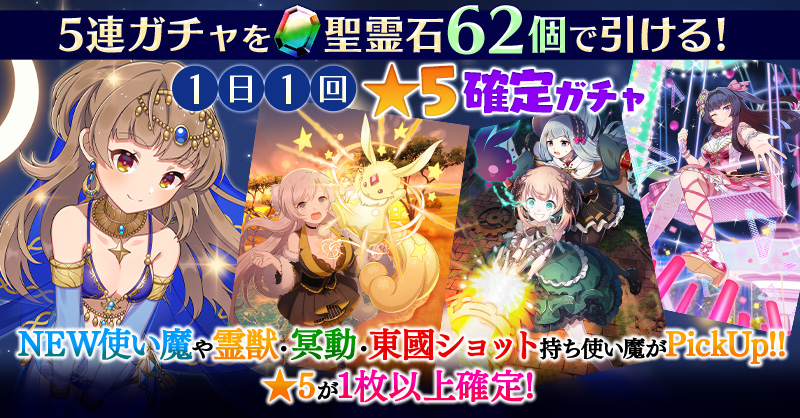 【一部NEW使い魔や霊獣・冥動・東國ショット持ち使い魔などがPickUP】1日1回★5確定ガチャ