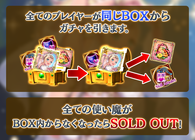 - 【BOX内すべての中身が0】もしくは【BOX内の目玉使い魔の残数が0】になった場合、「SOLD OUT」となり、本シェアBOXガチャを引くことができなくなります。