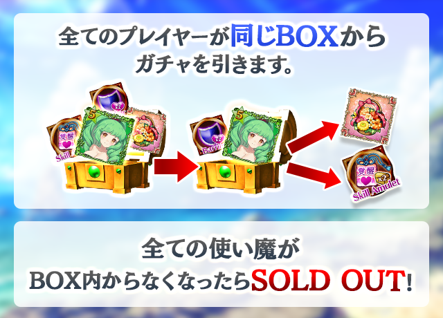 - 【BOX内すべての中身が0】もしくは【BOX内の目玉使い魔の残数が0】になった場合、「SOLD OUT」となり、本シェアBOXガチャを引くことができなくなります。