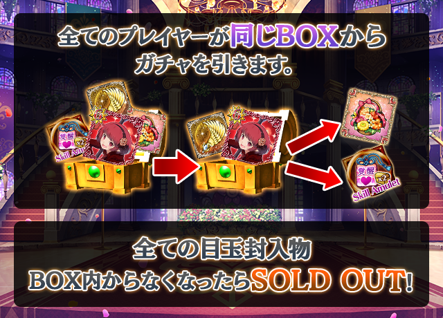 - 【BOX内すべての中身が0】もしくは【BOX内の目玉封入物の残数が0】になった場合、「SOLD OUT」となり、本シェアBOXガチャを引くことができなくなります。