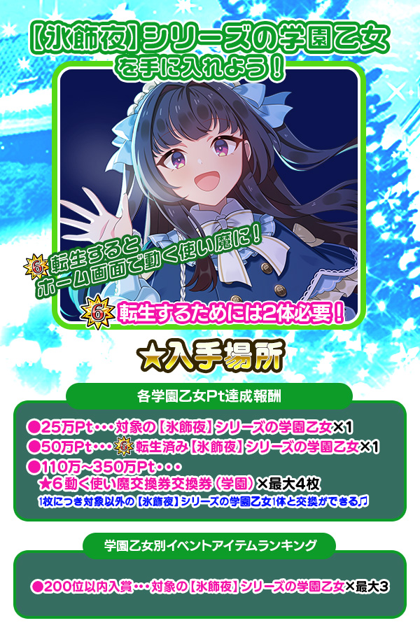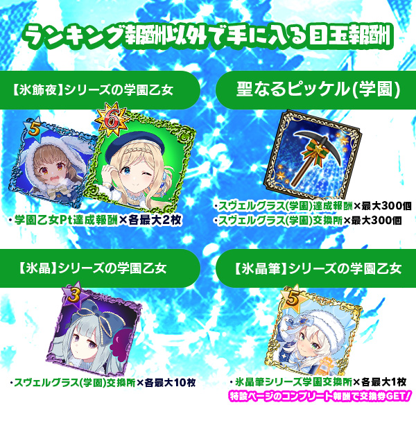 | レギュレーション | キャラクター限定:【氷飾祭】【氷晶】【氷飾夜】【氷晶筆】シリーズの対象の学園乙女 アイテム使い放題 | ||