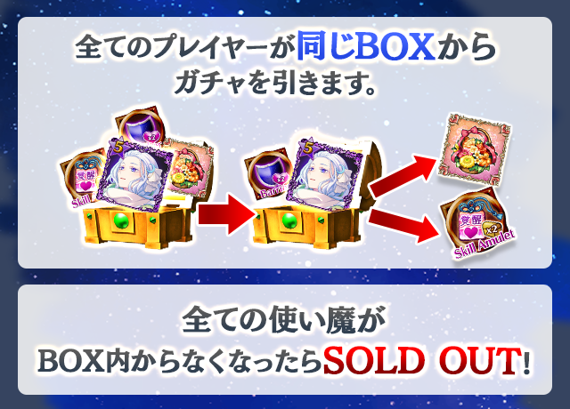 - 【BOX内すべての中身が0】もしくは【BOX内の目玉使い魔の残数が0】になった場合、「SOLD OUT」となり、本シェアBOXガチャを引くことができなくなります。