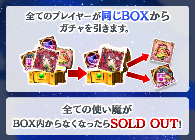 - 【BOX内すべての中身が0】もしくは【BOX内の目玉使い魔の残数が0】になった場合、「SOLD OUT」となり、本シェアBOXガチャを引くことができなくなります。