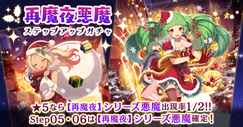 - 【再魔夜】シリーズの5悪魔のおでかけ衣装は、2017年にリリースした「Xmasサンタドレス」と同一の衣装となります。既に、該当の衣装を入手済の場合、新たに使い魔を入手しても衣装は付与されません。