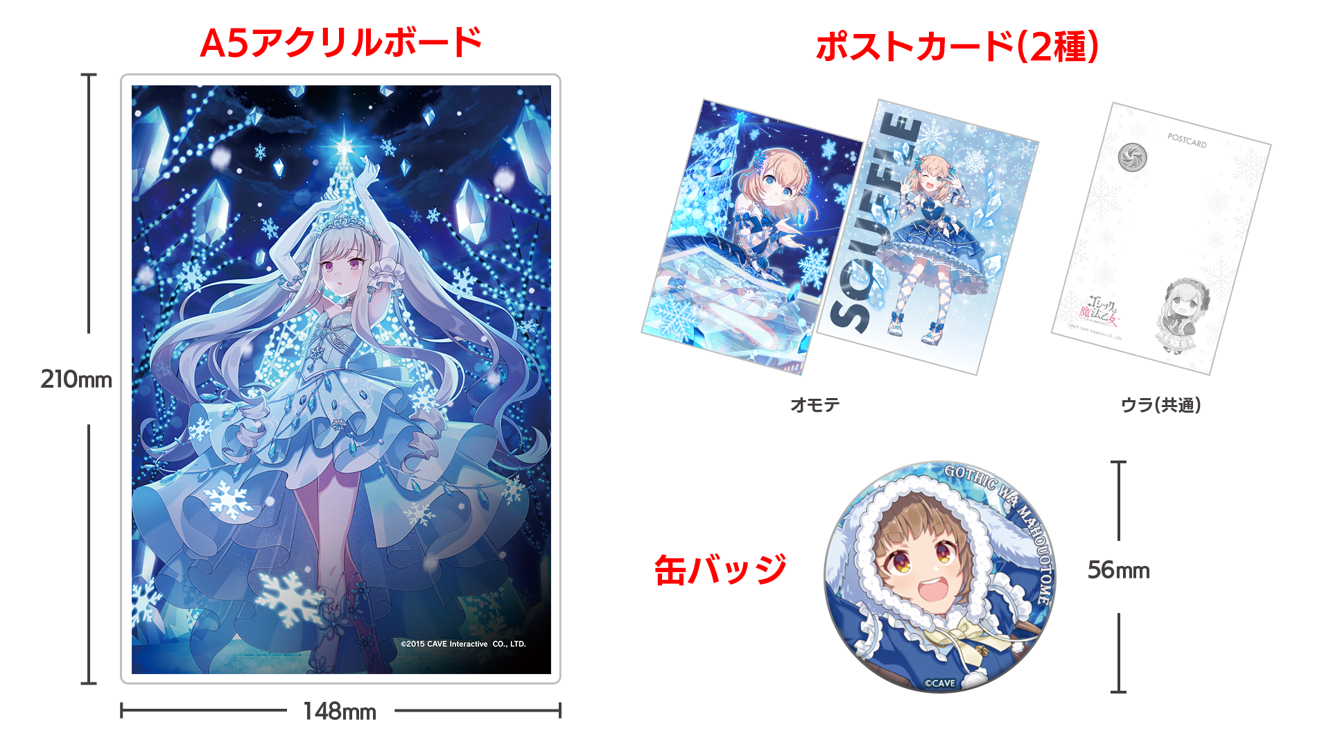 | サイズ | アクリルボード:210×148㎜ 缶バッジ:丸型 56×56㎜ ポストカード:148×100㎜ |