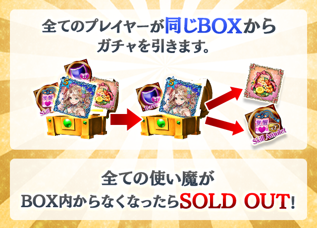 - 【BOX内すべての中身が0】もしくは【BOX内の目玉使い魔の残数が0】になった場合、「SOLD OUT」となり、本シェアBOXガチャを引くことができなくなります。